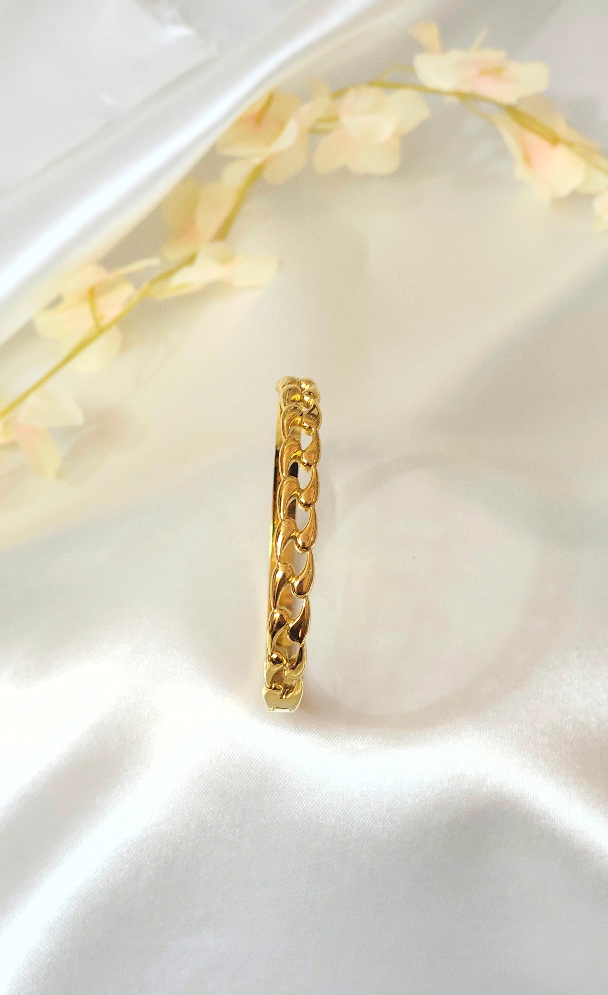 This sleek kada features a bold Cuban link-inspired motif, finished in radiant 18K gold-plated (anti-tarnish) for enduring shine. Its classic golden hue and solid build make it ideal for everyday casual or party wear, offering timeless style for any occasion.