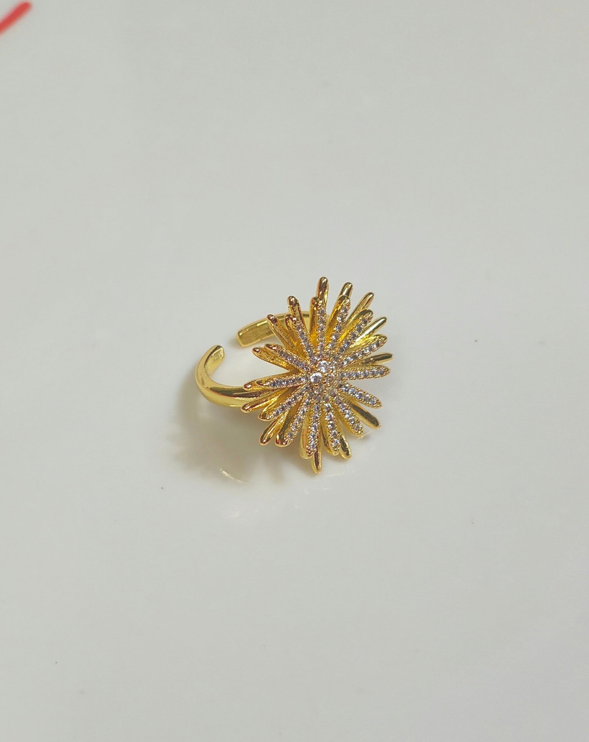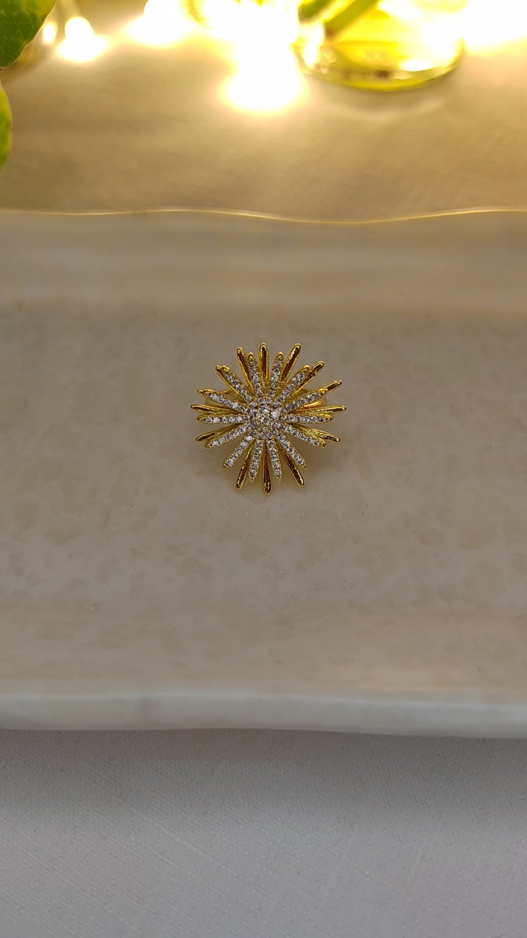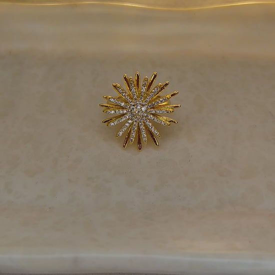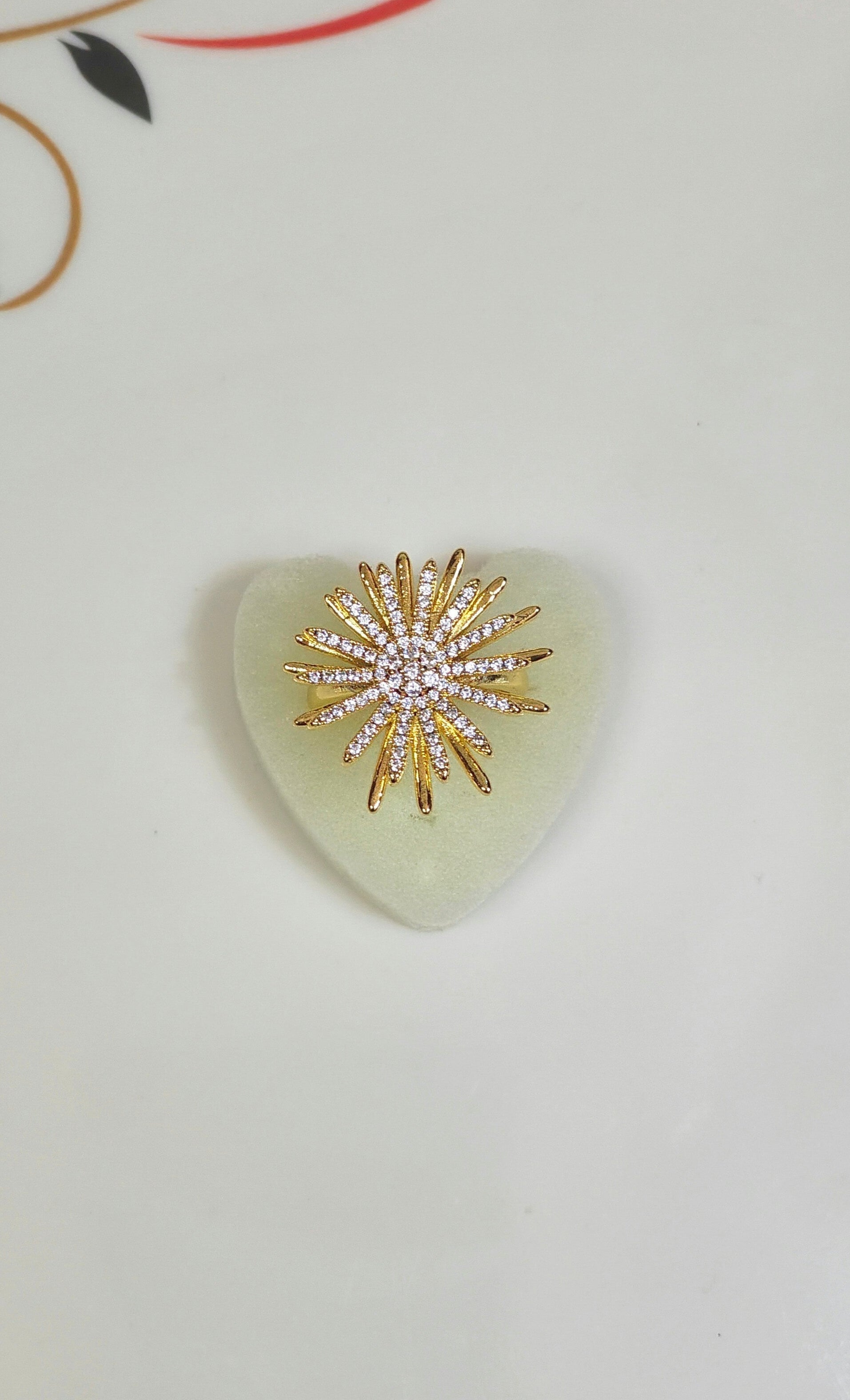 Crafted in 18K gold-plated (anti-tarnish) brass, this stunning ring features a dazzling sunburst motif encrusted with sparkling white stones. The radiant gold finish and shimmering design make it perfect for party and formal wear, adding a bold touch to any look