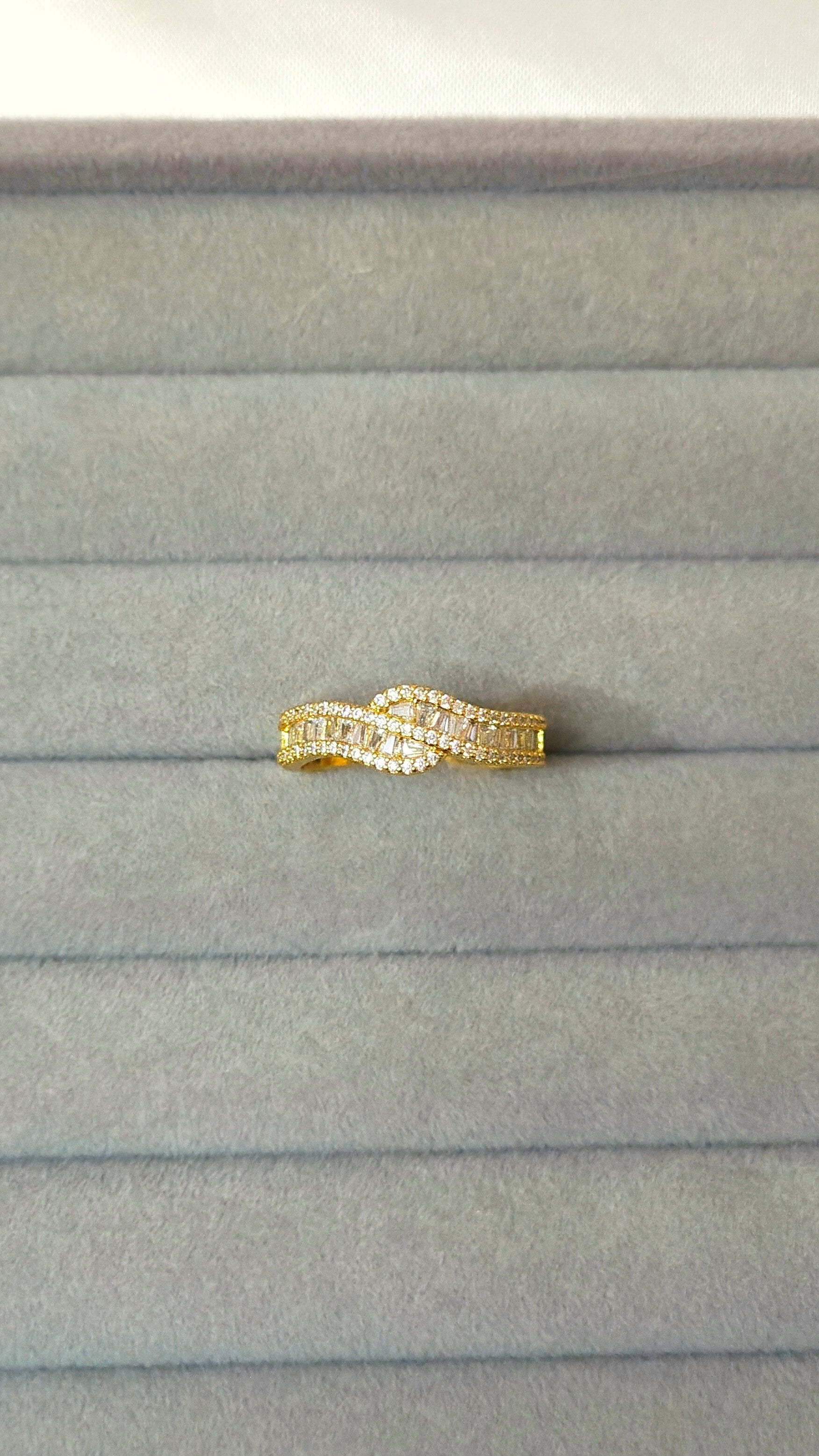 Crafted in 18K gold-plated (anti-tarnish) metal, this ring features a graceful wave design adorned with glittering cubic zirconia for a bold geometric motif. The lustrous gold and sparkling stones make it perfect for party and formal occasions.