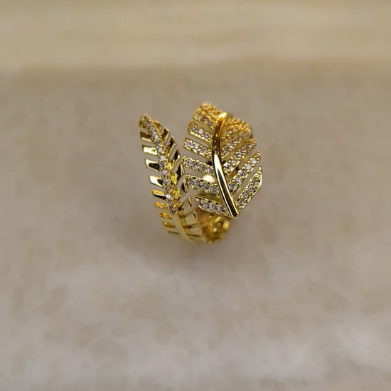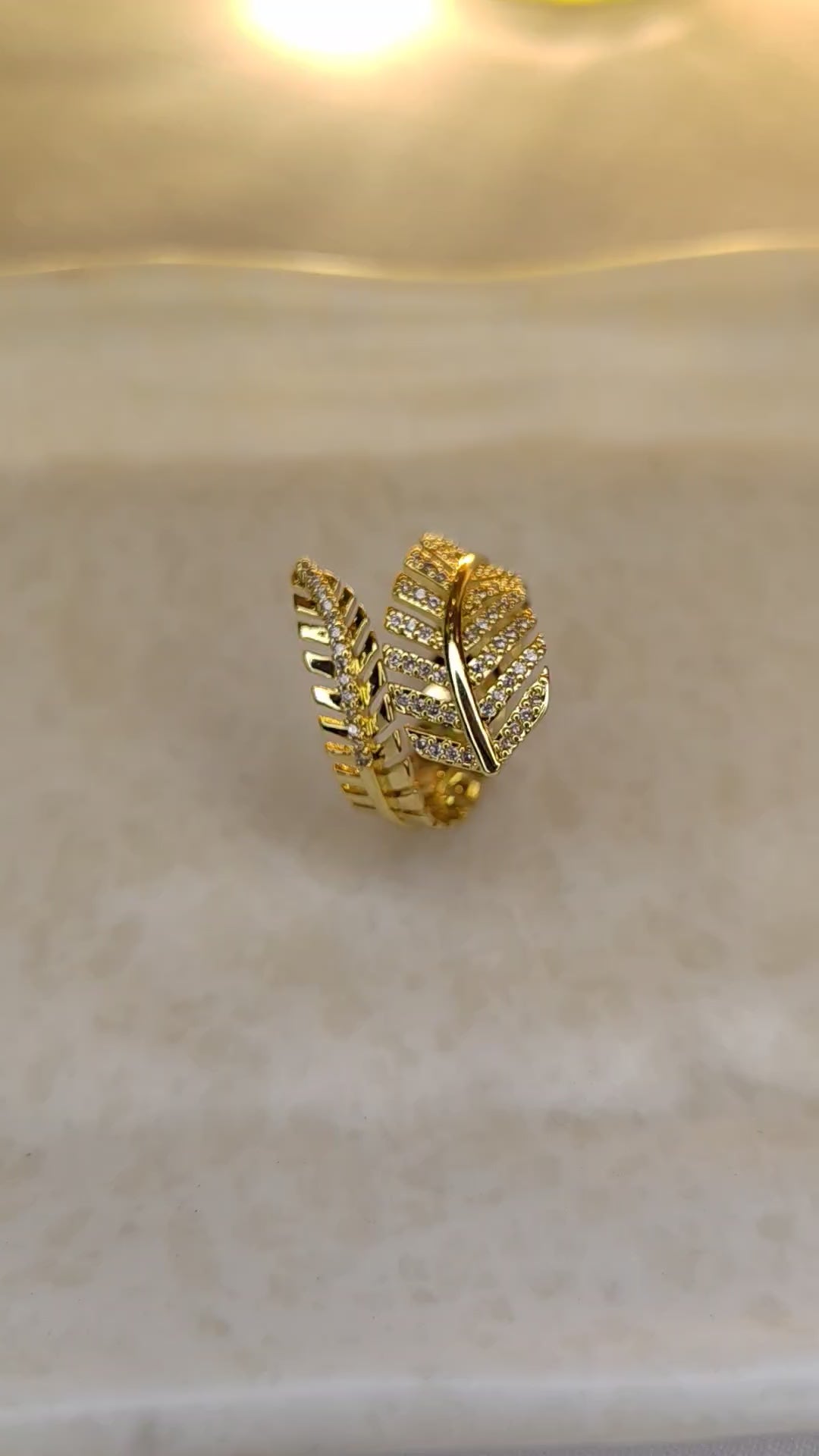Crafted in 18K gold-plated (anti-tarnish) metal, this eye-catching ring features a double leaf motif encrusted with sparkling white zircons. The radiant gold and elegant leaf design make it perfect for party or formal wear, adding nature-inspired glamour to any look