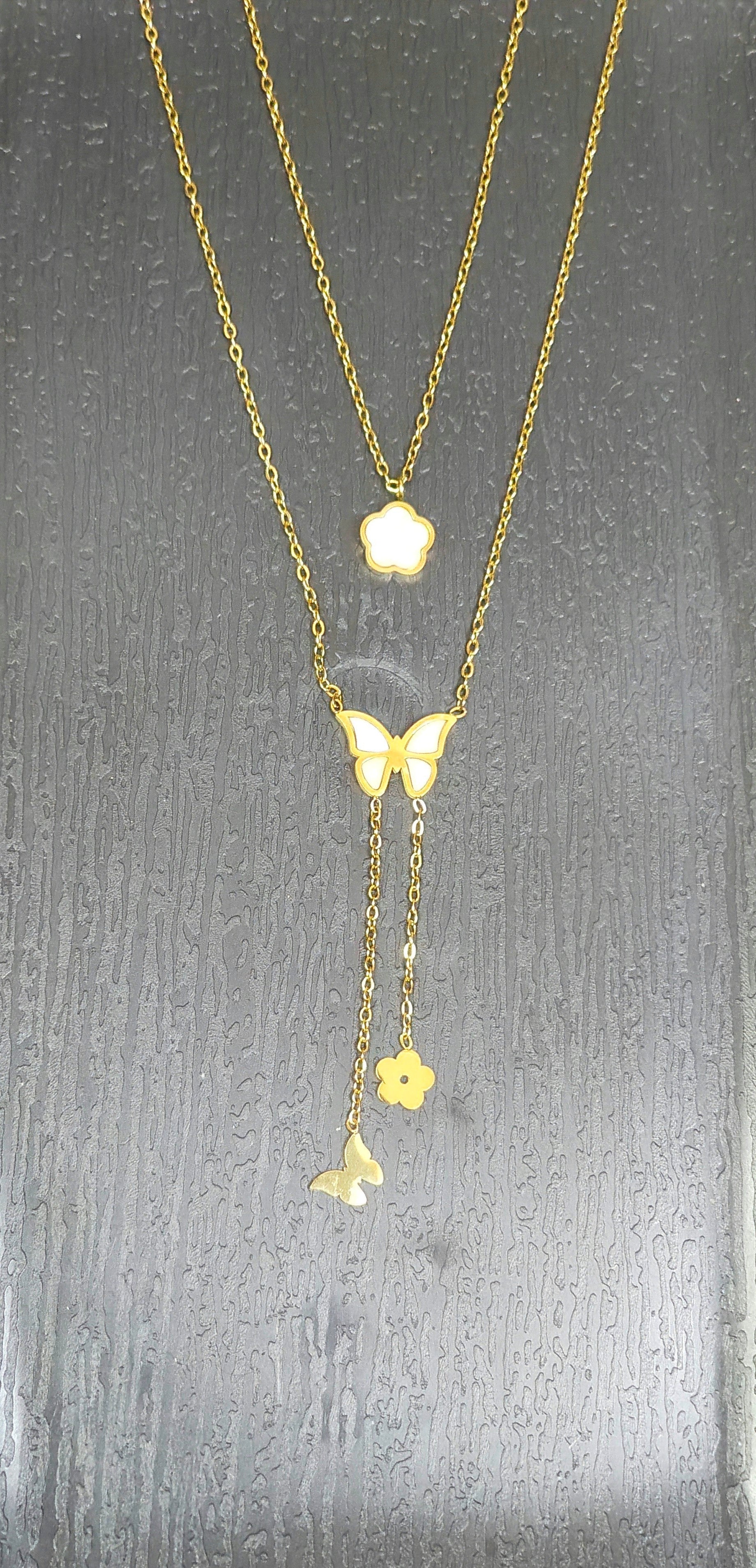 This elegant layered necklace is crafted with an anti-tarnish coating, featuring a delicate mother-of-pearl clover pendant and a charming butterfly motif with gold-tone accents. The duo-tone design in white and gold makes it perfect for casual and party wear, adding a playful yet sophisticated touch to any outfit.