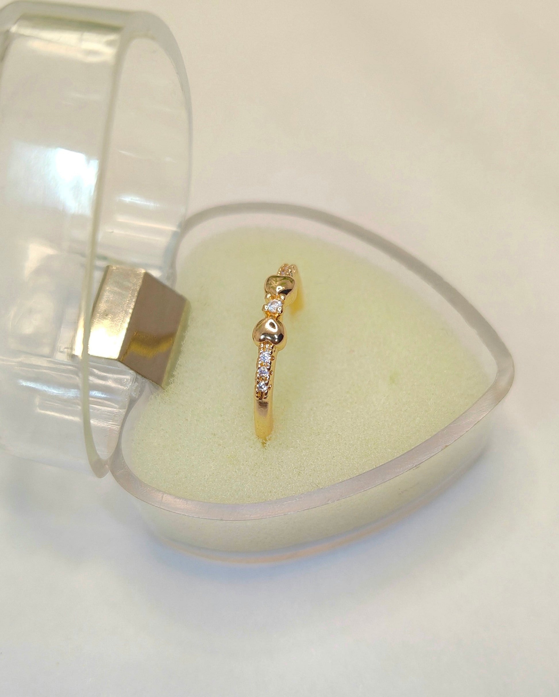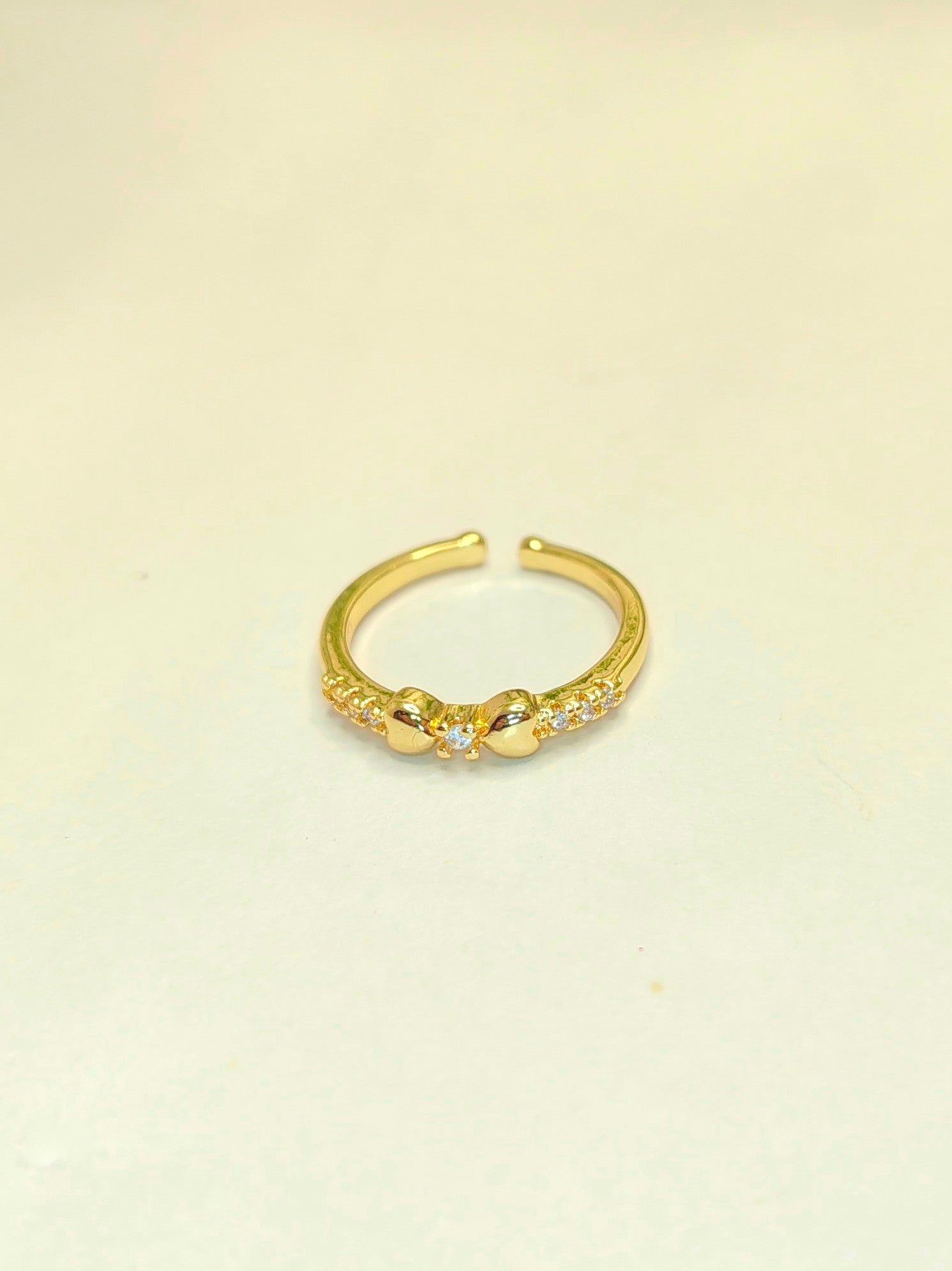 This elegant ring, crafted with an anti-tarnish finish, features twin gold-tone heart motifs accented by sparkling cubic zirconia along the band. Ideal for casual and party wear, its gleaming gold color and delicate heart design add a touch of romance to any outfit.