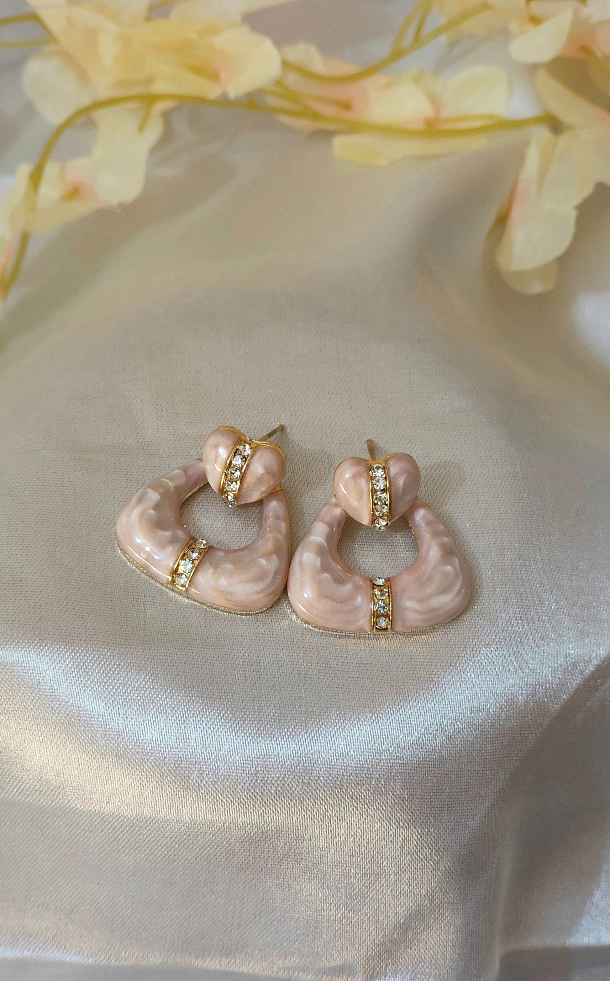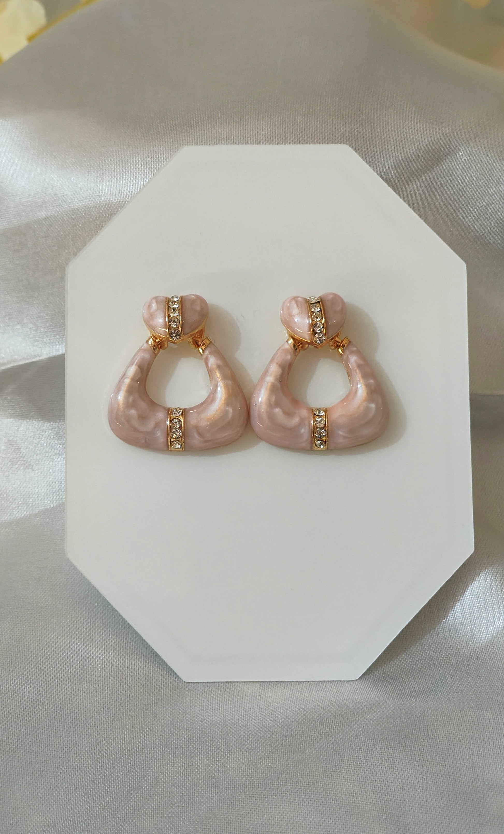 These stylish earrings feature a unique heart-meets-geometric drop design in soft pink enamel with sparkling crystal accents, finished in an anti-tarnish coating. Their pastel pink and gold tones are perfect for party and casual wear. Waterproof, skin friendly, and eco friendly—crafted for everyday comfort and confidence.
