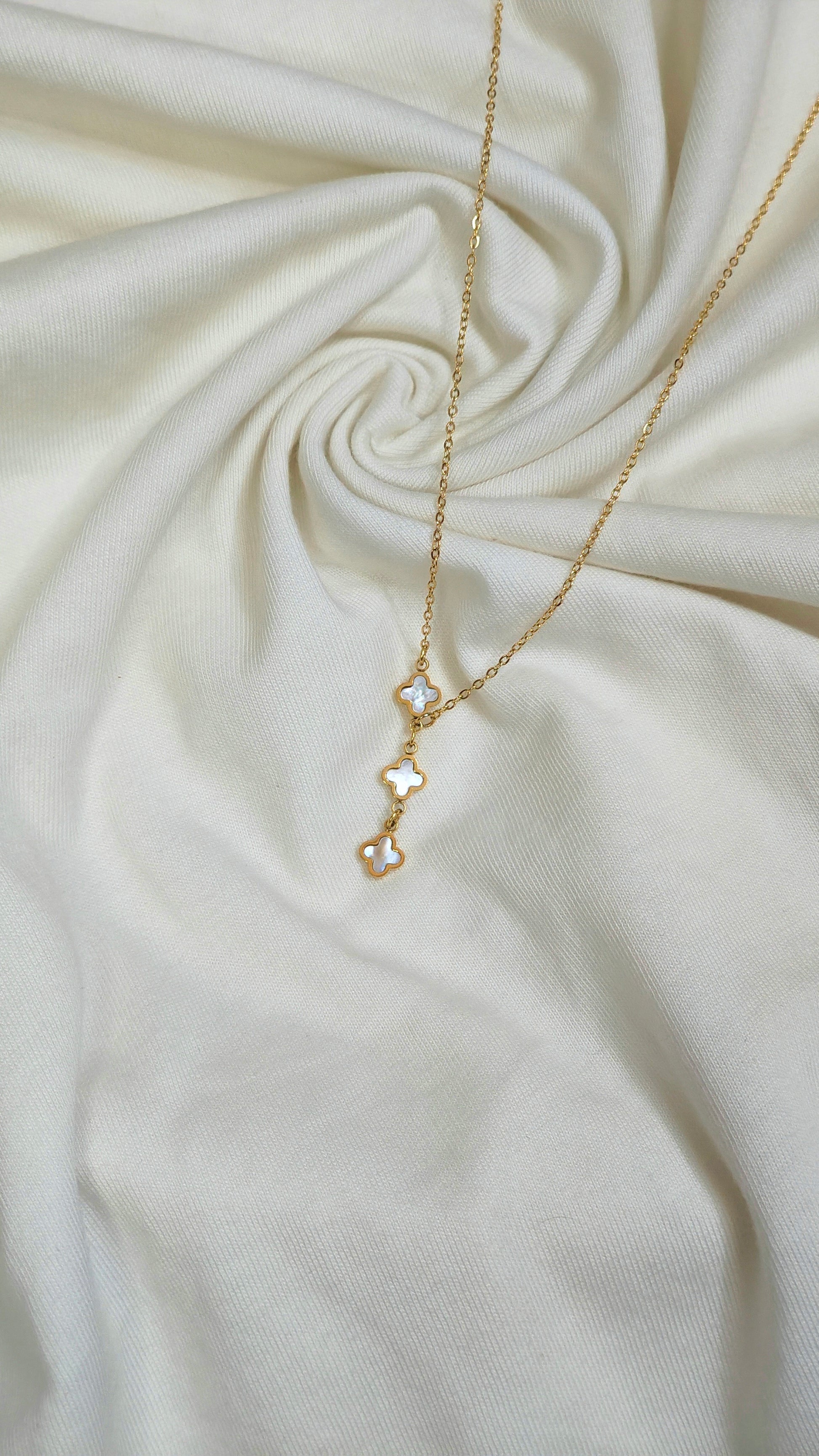 This elegant necklace features three delicate white clover charms on a gold-toned anti-tarnish chain. The geometric floral motif and subtle shine make it perfect for casual, office, or party wear, adding a touch of effortless sophistication to any outfit.