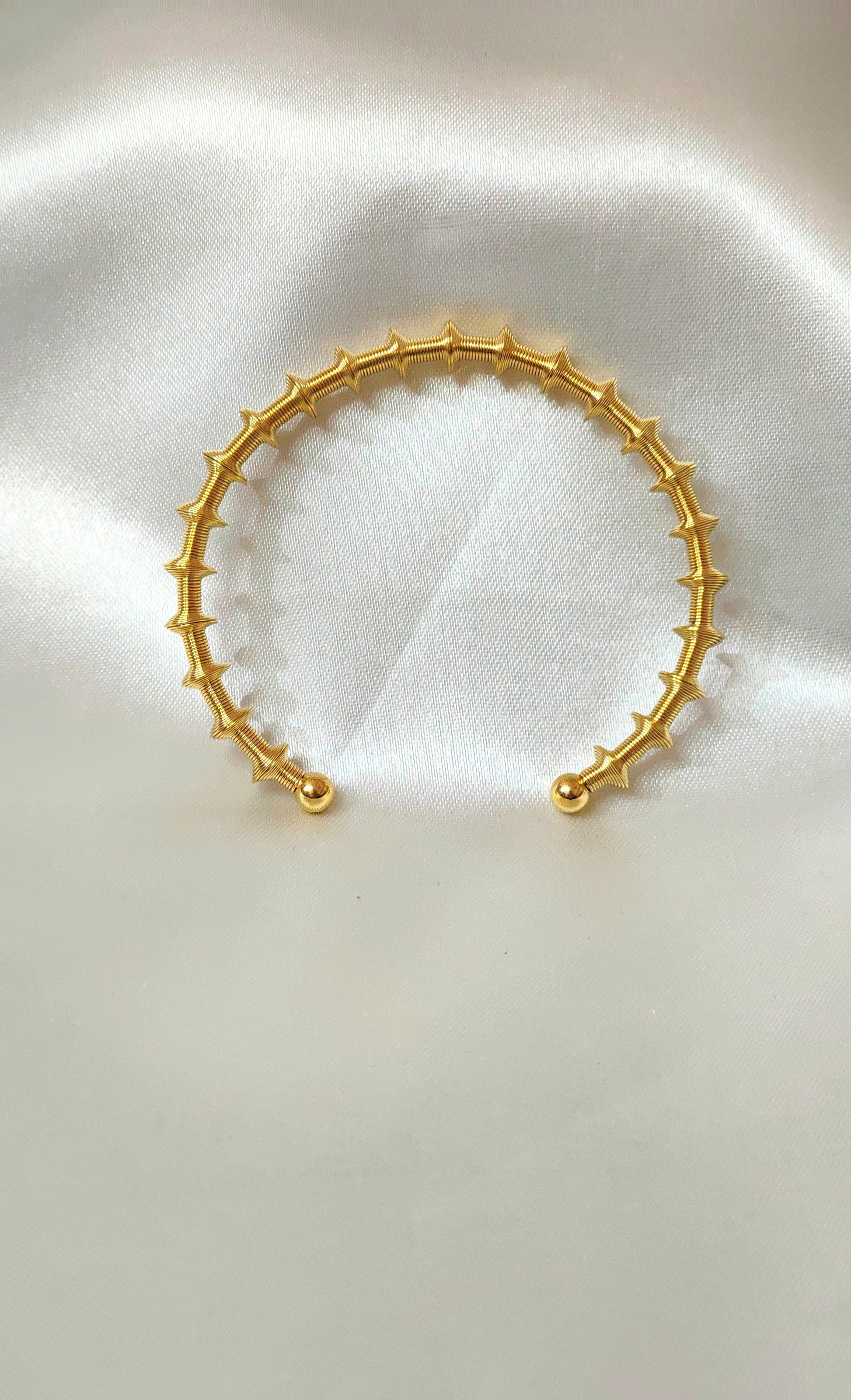 Elevate any outfit with this striking bracelet, crafted from gold-plated (anti-tarnish) material for lasting shine and durability. The piece features a bold geometric textured wire motif in a vibrant gold tone, perfect for casual and party wear. Its unique open-cuff design adds a contemporary flair to your jewellery collection.