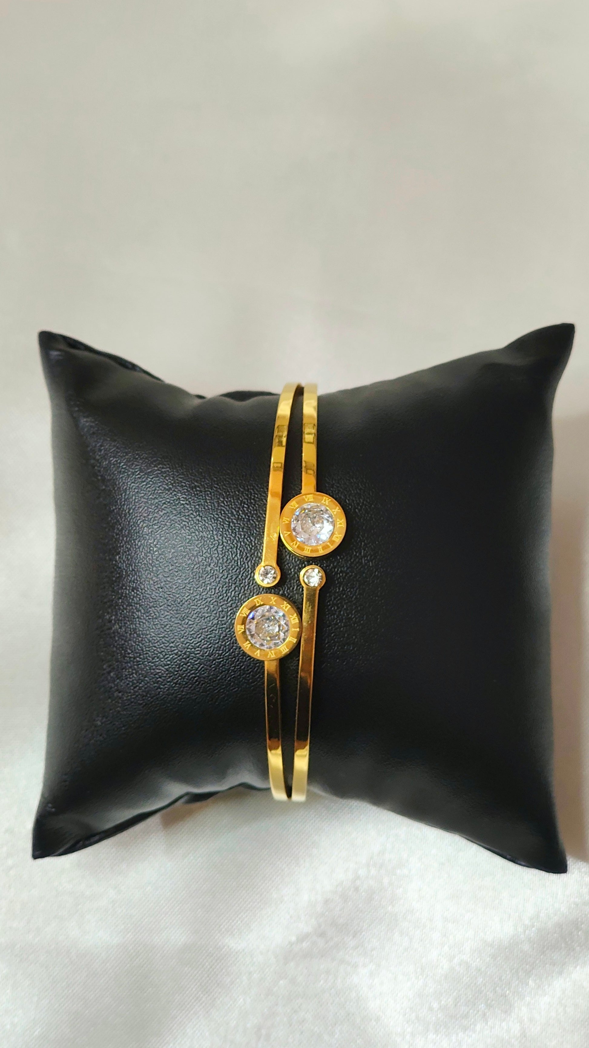 This beautiful bracelet features a sleek geometric twin-solitaire design, crafted in premium gold-plated (anti-tarnish) metal. The sparkling stones and modern gold finish make it ideal for both party and formal occasions, adding a touch of sophistication to any outfit. Perfect for those seeking stylish and durable jewellery.