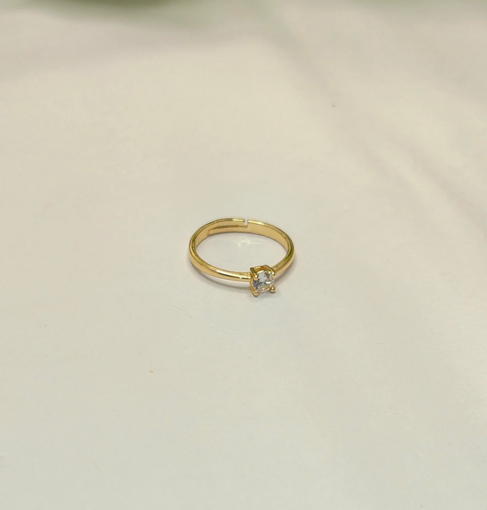 Crafted in gold-plated (anti-tarnish) metal, this elegant ring features a single sparkling solitaire stone in a timeless prong setting. The radiant gold and clear crystal make it perfect for daily wear, parties, or as a minimal yet sophisticated proposal ring.