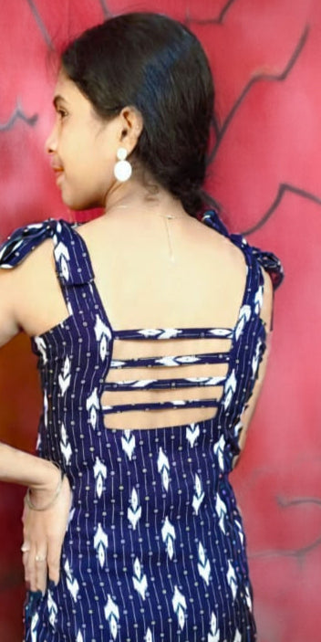This likely cotton kurti features a striking navy blue base with a white Ikat-inspired print, giving it a timeless ethnic charm. The straight cut and strappy shoulder tie details add a modern touch, while the back ladder design creates extra visual interest. Ideal for daily wear or casual outings, this kurti pairs effortlessly with jeans or leggings for a chic, comfortable look.