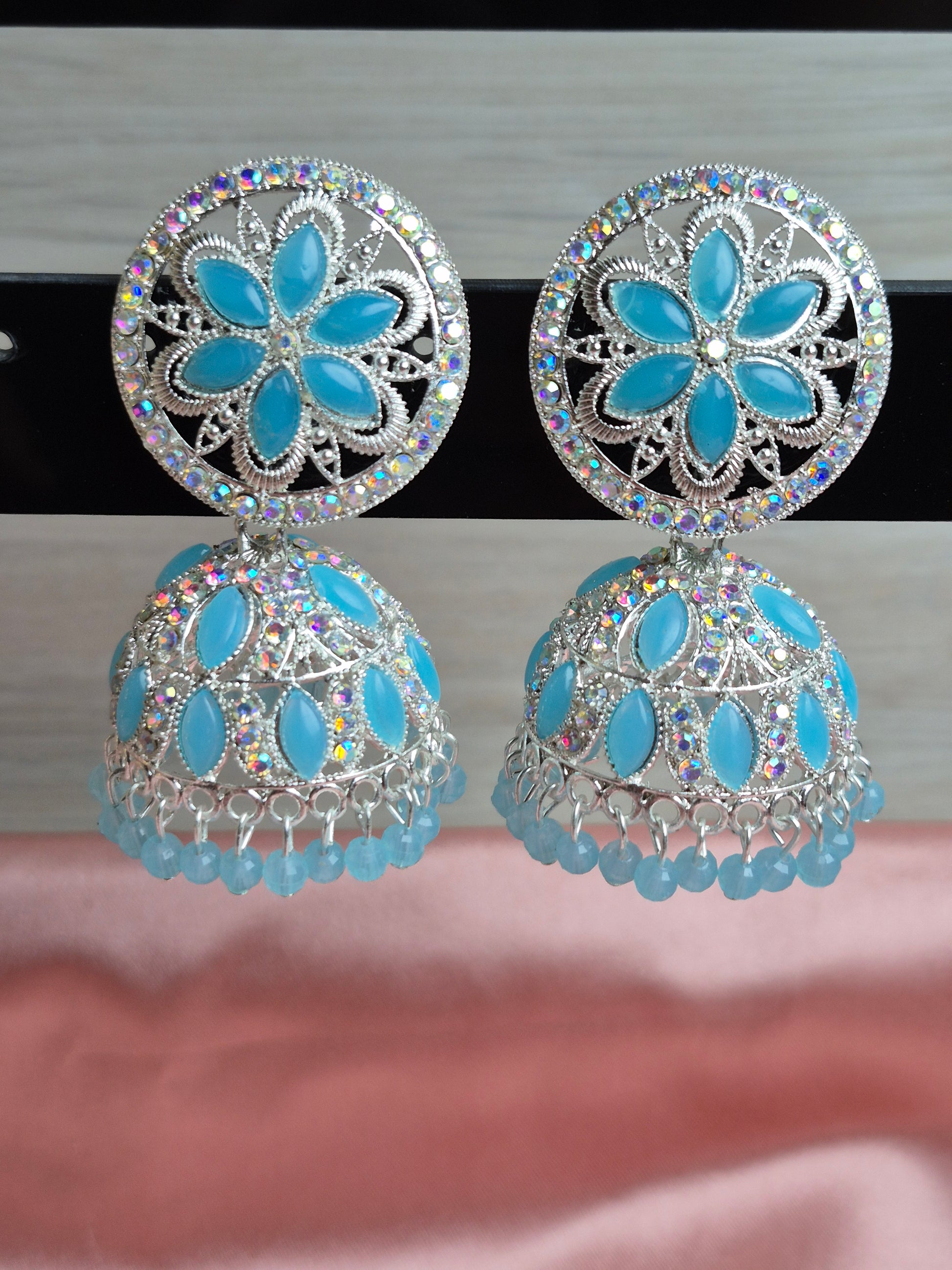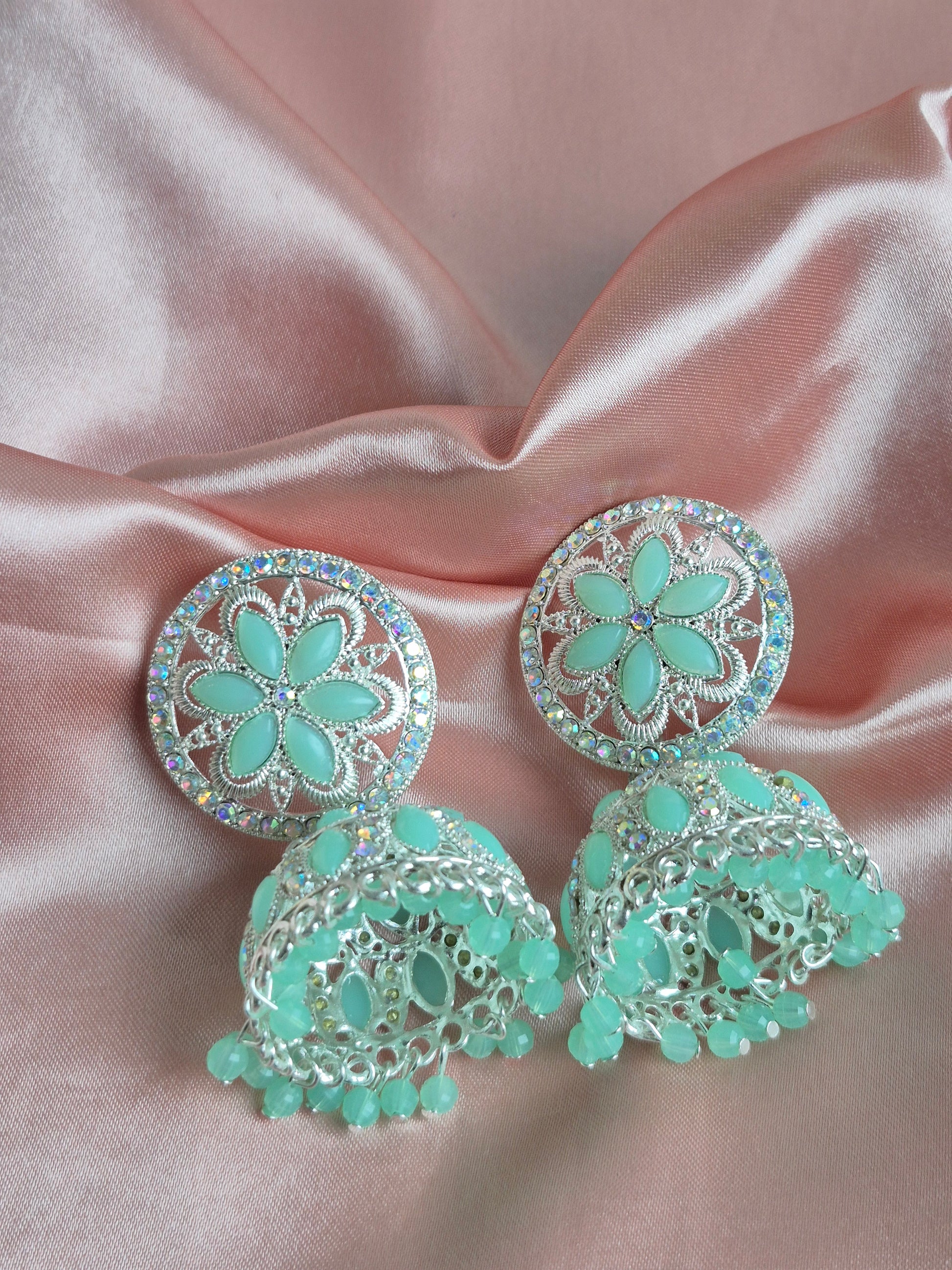 Mint Floral Jhumka Earrings – Stone Studded Statement Jewelry for Ethnic Wear