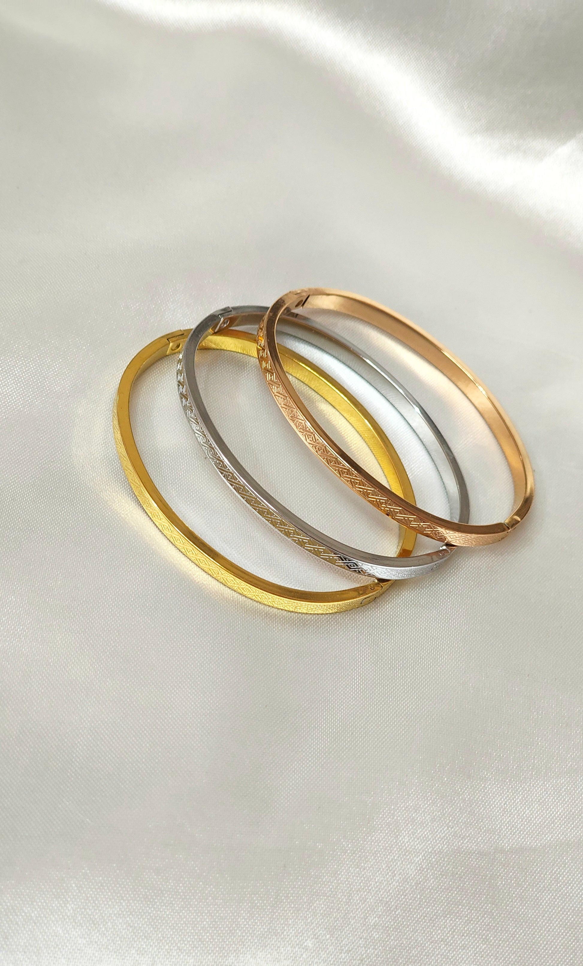 Elegant gold-plated (anti-tarnish) bangle set featuring classic geometric motifs in gold, silver, and rose gold tones. The smooth finish and delicate engravings make these bangles perfect for both casual and party wear, adding a timeless touch to any look.