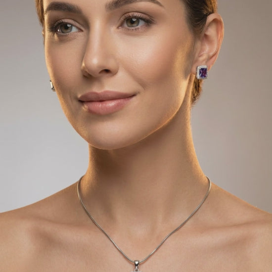 This product is a women’s silver-tone necklace featuring a square purple stone pendant framed by small clear stones. The sleek, simple chain sits comfortably around the neck, making it suitable for both daily wear and special occasions. The pendant’s vibrant purple center adds a pop of color, while the surrounding stones create a subtle sparkle that draws attention to the neckline. Designed for women who prefer elegant and minimal jewelry, it pairs well with both Western and ethnic outfits. The lightweight design makes it easy to wear for long hours, whether at work, dinners, or celebrations. Add this purple stone pendant necklace to your collection for an easy way to elevate your everyday look with a touch of refined glamour.