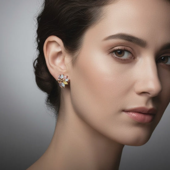These vibrant women's stud earrings display a flower shape with multicolored stones in pink, purple, blue, and clear tones arranged across radiating petals. The colorful gems create a playful, radiant sparkle evident in angled and close-up shots. Great for women who enjoy fun, eclectic accessories for festivals, casual gatherings, beach outings, or vibrant ethnic celebrations. The small-to-medium studs offer a secure fit and lightweight feel, perfect for lively movement without slipping. Set in shiny metal, the design brings a burst of color that complements printed dresses, kurtas, or summer tops beautifully. Ideal for adding personality to everyday or festive wardrobes. Brighten your day and turn simple looks into joyful statements with these lively, multicolored floral studs.