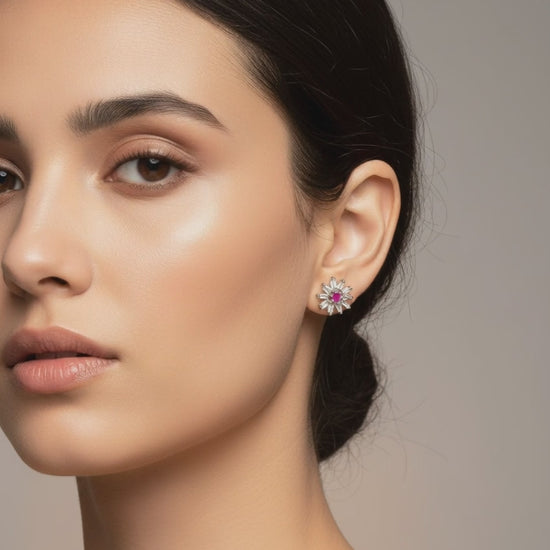 These elegant women's stud earrings feature a floral design with a central pink stone surrounded by clear sparkling accents, set in a silver-tone metal. The flower-shaped studs have a delicate, open petal structure that catches the light beautifully from multiple angles. Perfect for women seeking subtle yet glamorous accessories for daily wear, office settings, ethnic outfits, or special events like parties and weddings. The compact size ensures they sit comfortably on the earlobes without pulling or discomfort, making them suitable for all-day use. Crafted with fine detailing, the earrings offer a sophisticated look that complements both Western and traditional Indian attire, such as sarees or kurtas. Hypoallergenic silver plating minimizes irritation for sensitive skin. Elevate your everyday style effortlessly with these versatile, eye-catching studs that add a touch of femininity and shine to any ensemble.